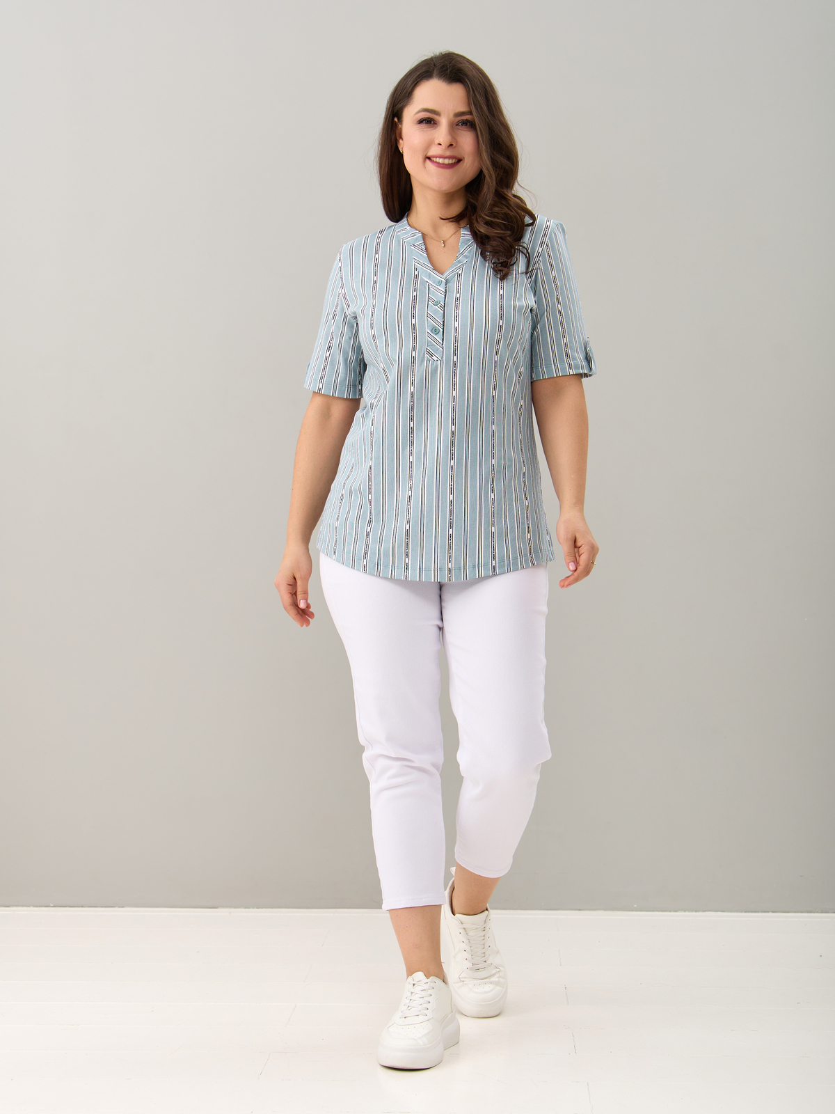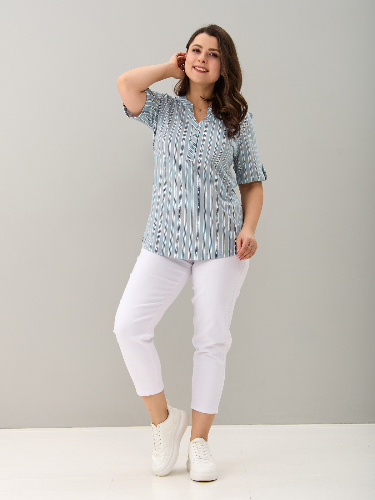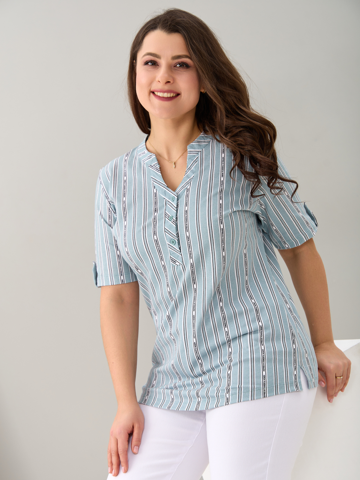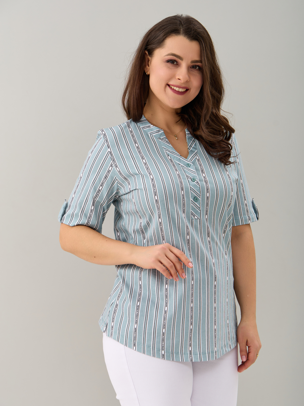- Блузка женская больших размеров офисная выполнена из 100% хлопка, трикотажного полотна, плетения кулир. Блузка повседневная хлопковая средней длины, с фигурным вырезом горловины и застежкой на пуговицы. Благодаря своей универсальности Вы можете надеть ее на работу, в гости, на отдыхе, даче и даже дома. Блузка с коротким рукавом сочетается с брюками, джинсами, подходит для домашней и повседневной носки. Кроме этого блузка трикотажная с коротким рукавом может играть роль блузки на выход или блузки на работу. Также уникальный крой позволит Вам выбрать свой идеальный размер, который выделит все ваши достоинства. Такая блузка будет отличным подарком для девушки, жены, бабушки, мамы, дочки, подруги, коллеги на новый год, 8 марта, день рождения. Все товары бренда АЛТЕКС отшиты на собственном производстве в России. Благодаря отработанным лекалам и качественному пошиву наши изделия добротные и прекрасно сидят на любой фигуре!