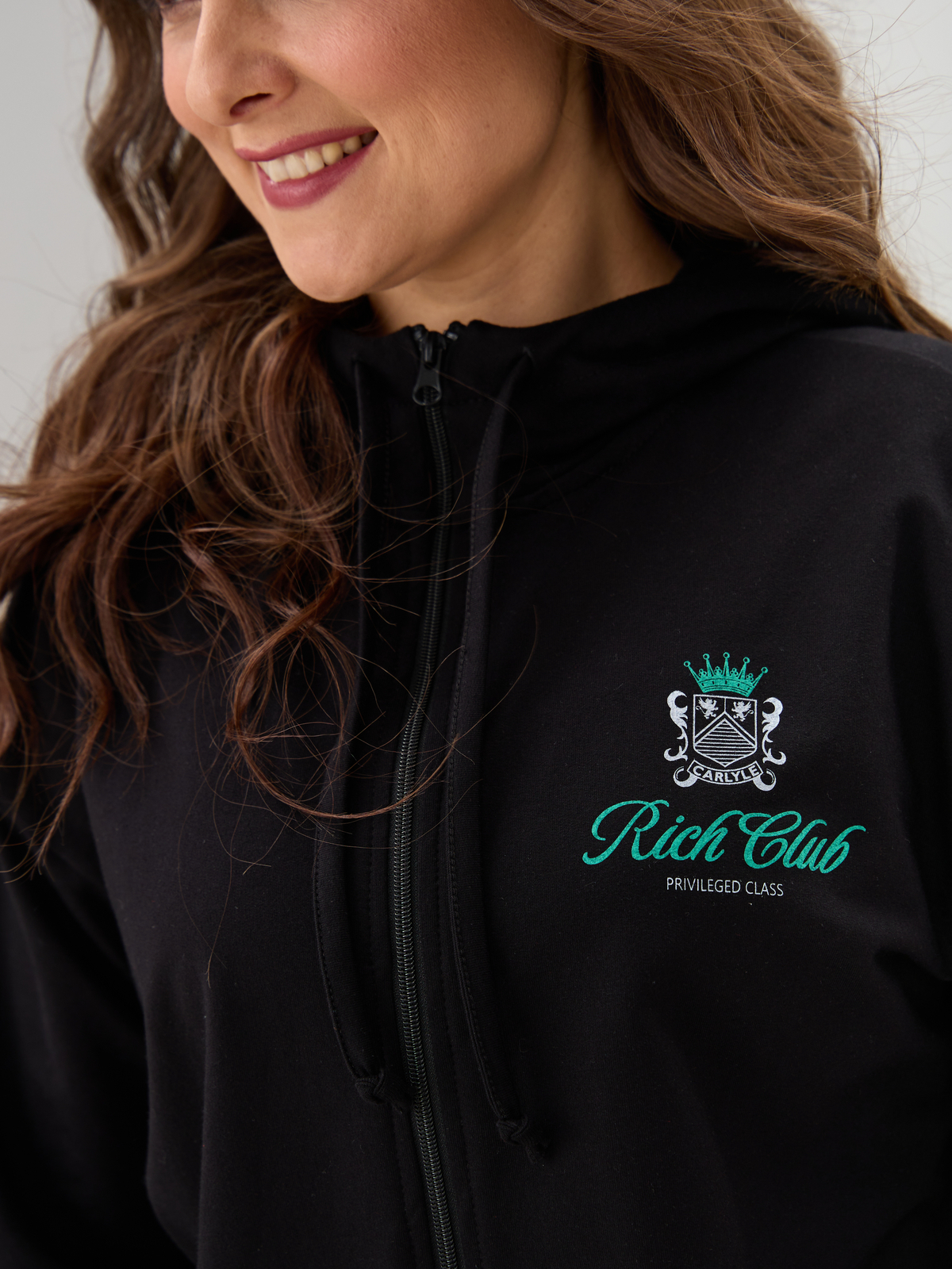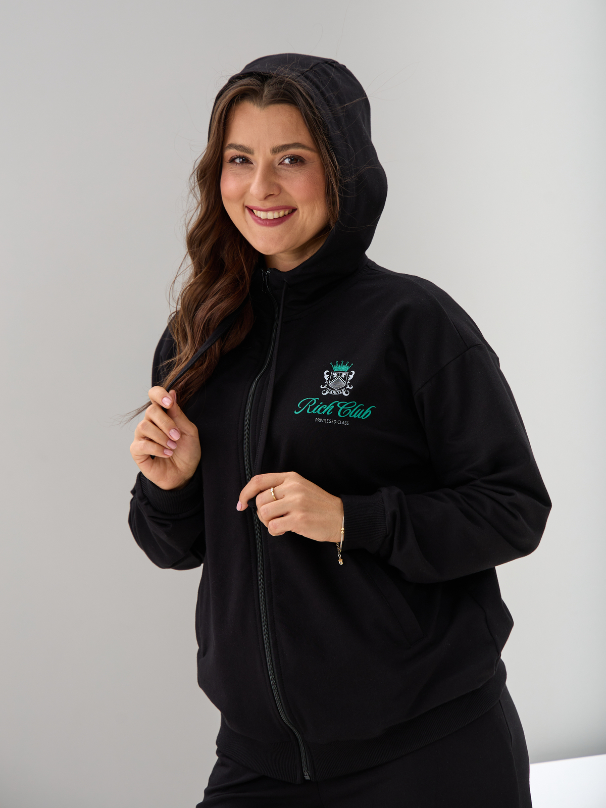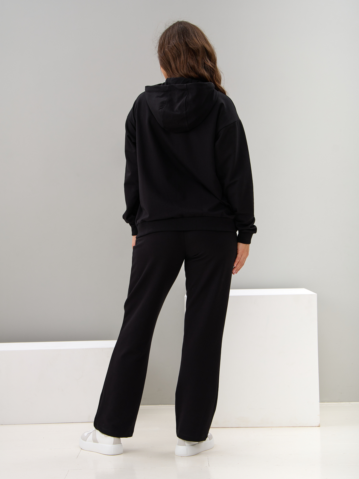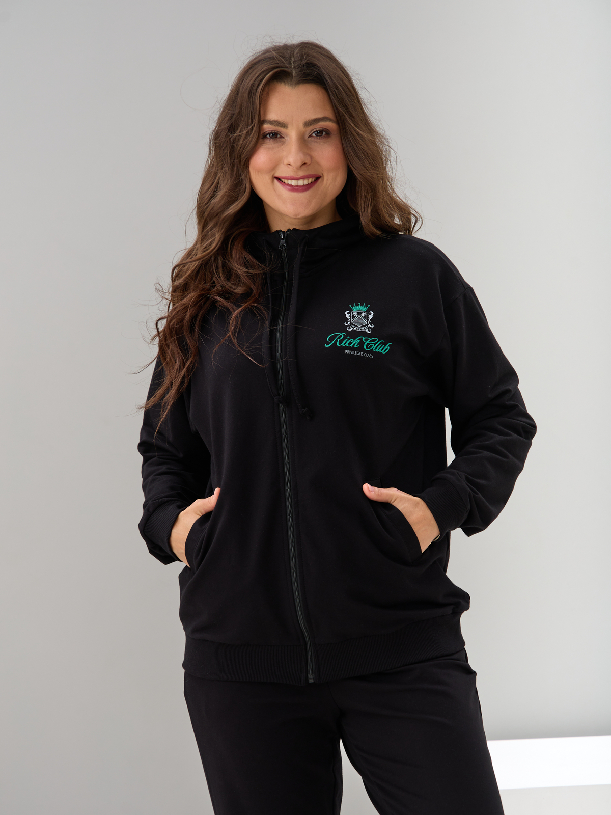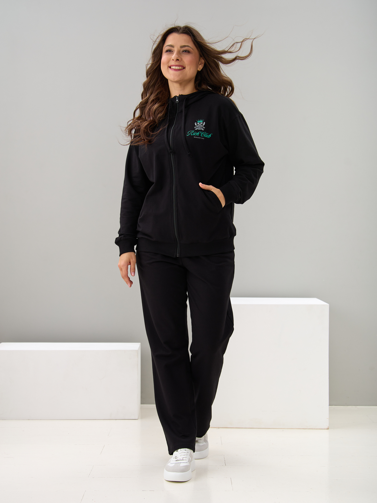 - Женский спортивный костюм больших размеров с капюшоном, выполненный из мягкого и приятного на ощупь полотна футер. В комплекте свободная толстовка с длинными рукавами на молнии, с капюшоном и брюки прямого кроя с поясом на резинке. Рукава и низ толстовки на широкой резинке, по бокам модели удобные карманы. Брюки со средней посадкой также оснащены боковыми карманами. Костюм женский спортивный больших размеров позволит Вам чувствовать себя комфортно и легко, благодаря своей натуральной и дышащей ткани, это отличная одежда для работы, дома и дачи. Костюм женский хлопковый трикотажный имеет большую размерную сетку и каждая может найти свой идеальный размер. Костюм женский повседневный