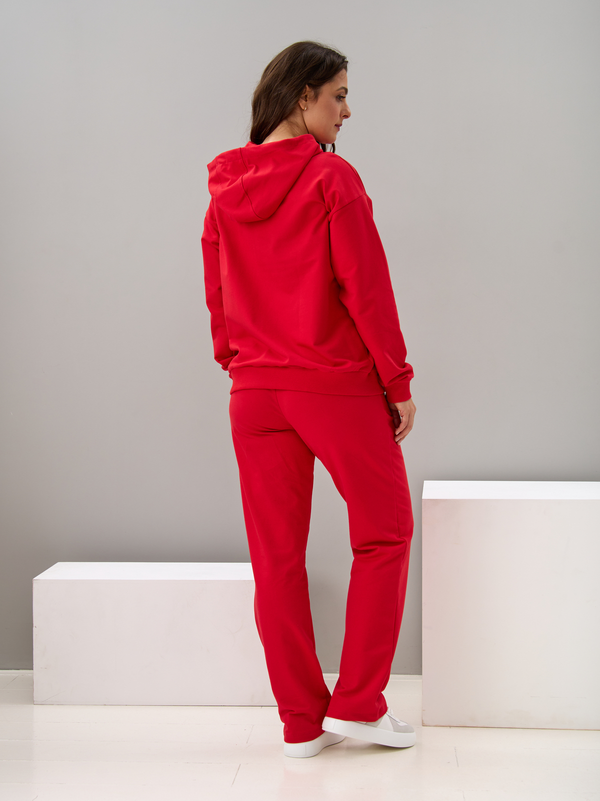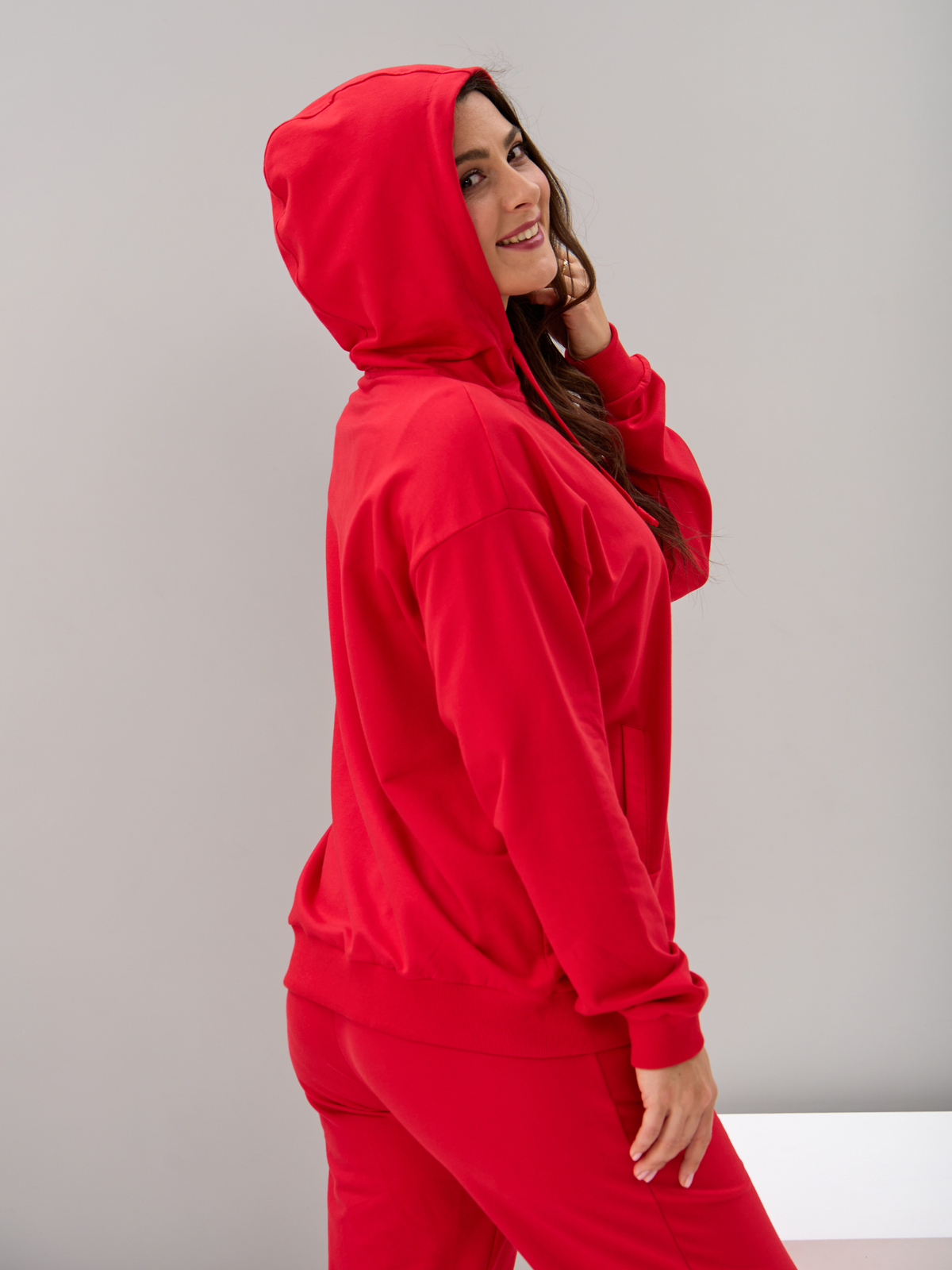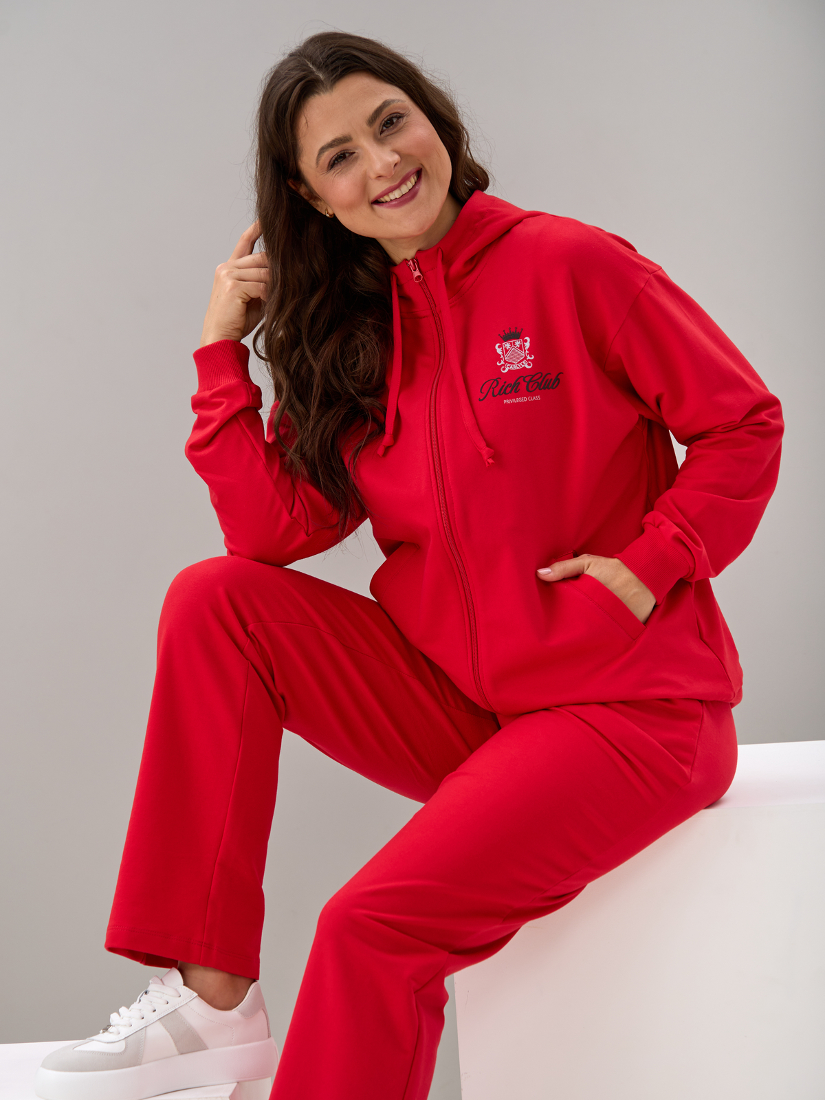 - Женский спортивный костюм больших размеров с капюшоном, выполненный из мягкого и приятного на ощупь полотна футер. В комплекте свободная толстовка с длинными рукавами на молнии, с капюшоном и брюки прямого кроя с поясом на резинке. Рукава и низ толстовки на широкой резинке, по бокам модели удобные карманы. Брюки со средней посадкой также оснащены боковыми карманами. Костюм женский спортивный больших размеров позволит Вам чувствовать себя комфортно и легко, благодаря своей натуральной и дышащей ткани, это отличная одежда для работы, дома и дачи. Костюм женский хлопковый трикотажный имеет большую размерную сетку и каждая может найти свой идеальный размер. Костюм женский повседневный