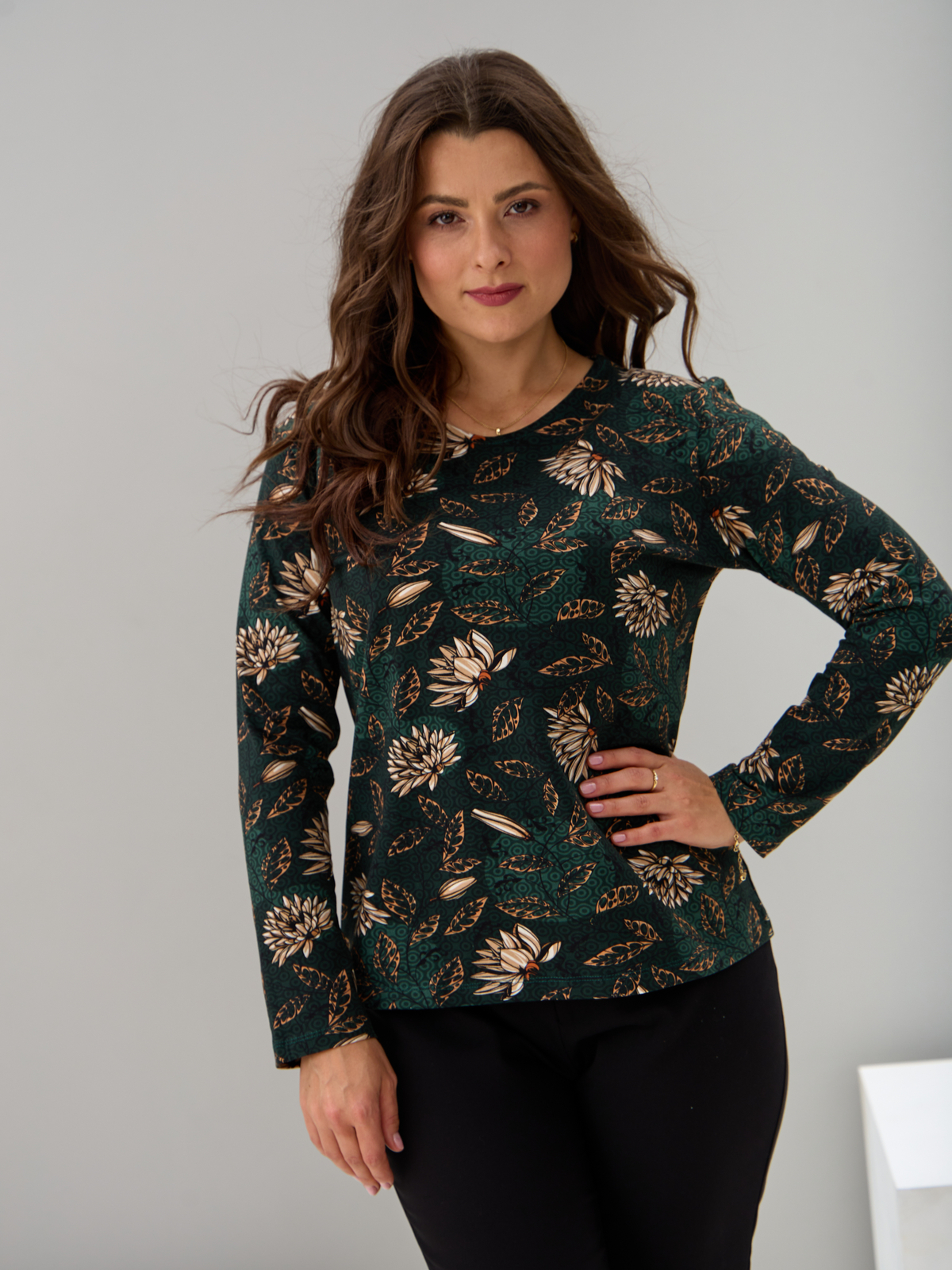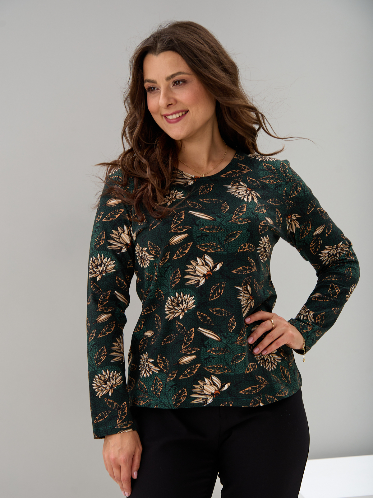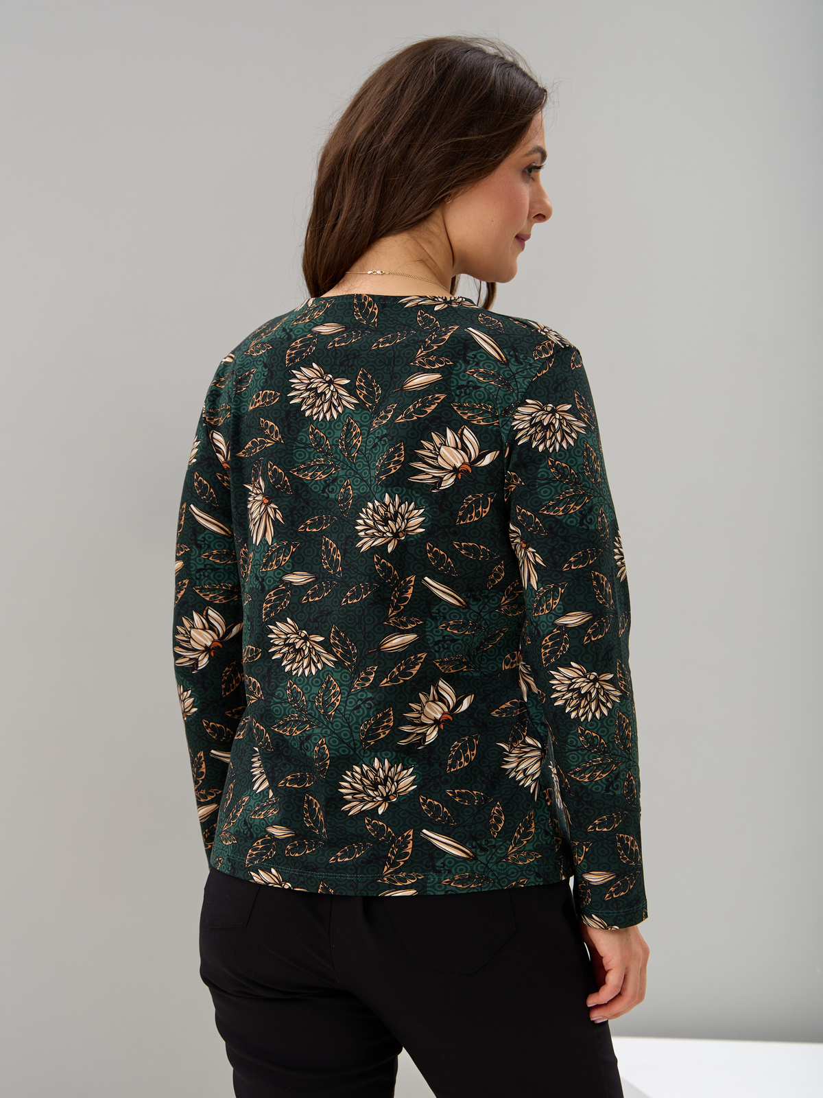 Лонгслив ЛНкл-081/изумрудный-хризантемы