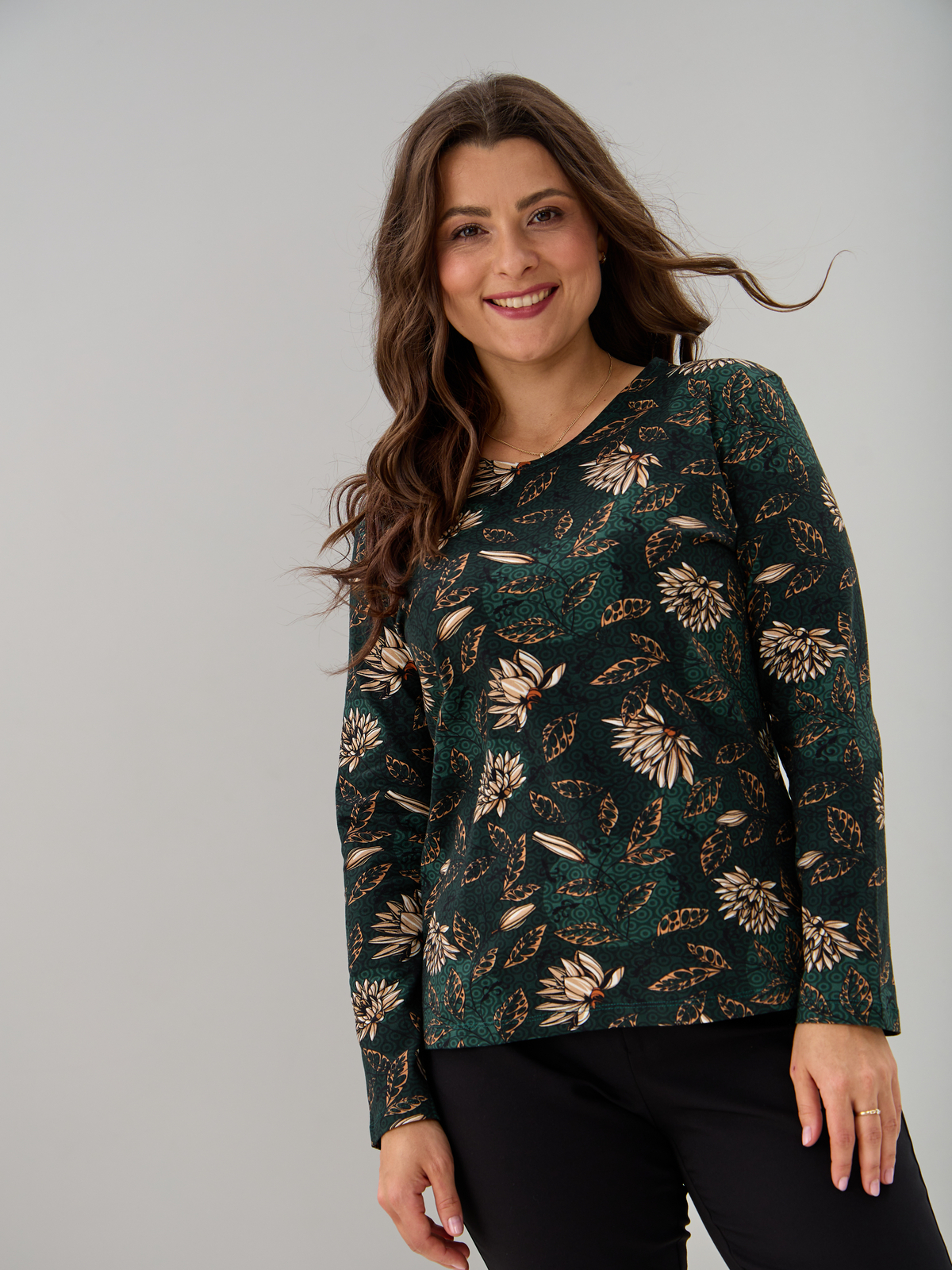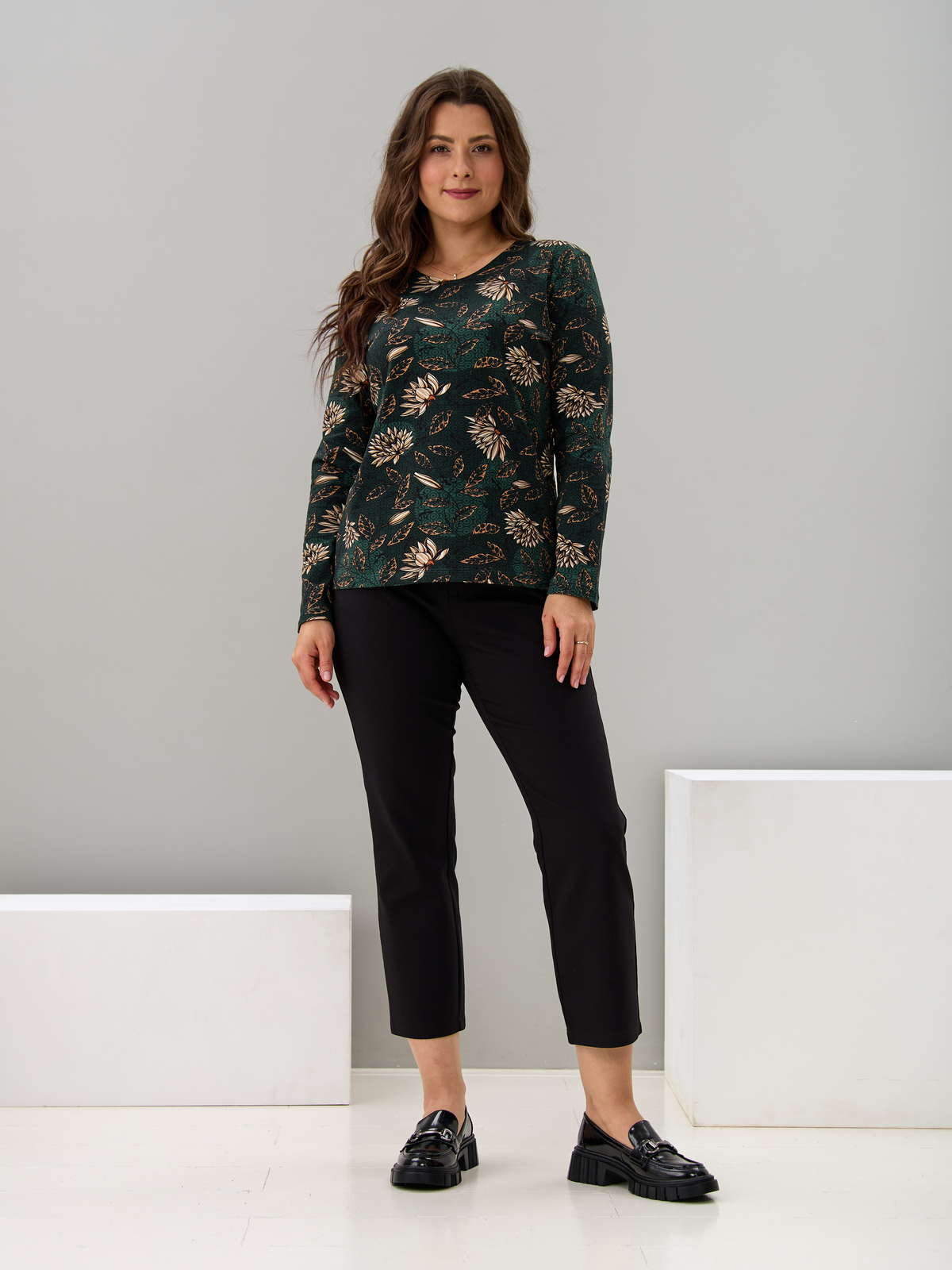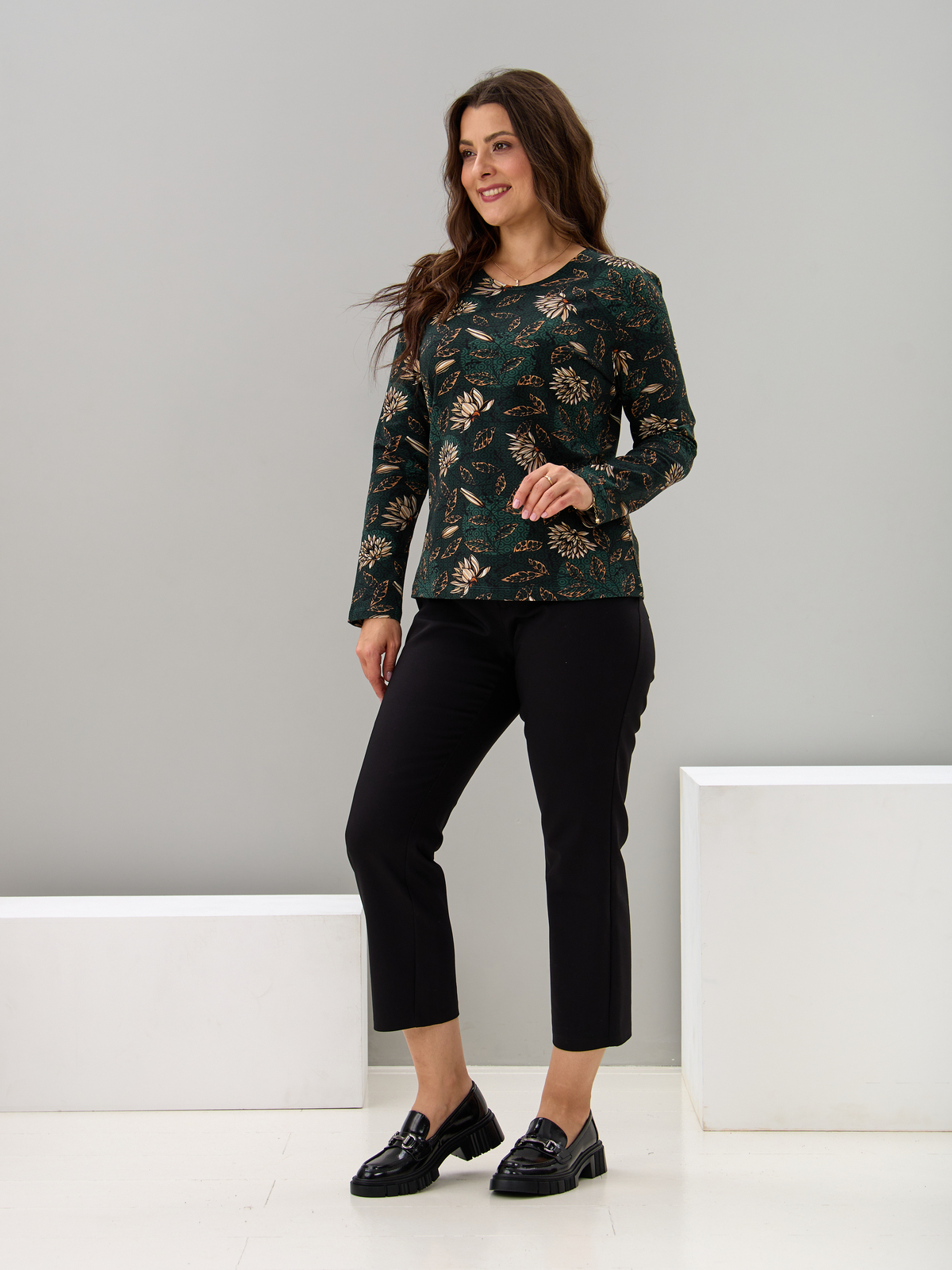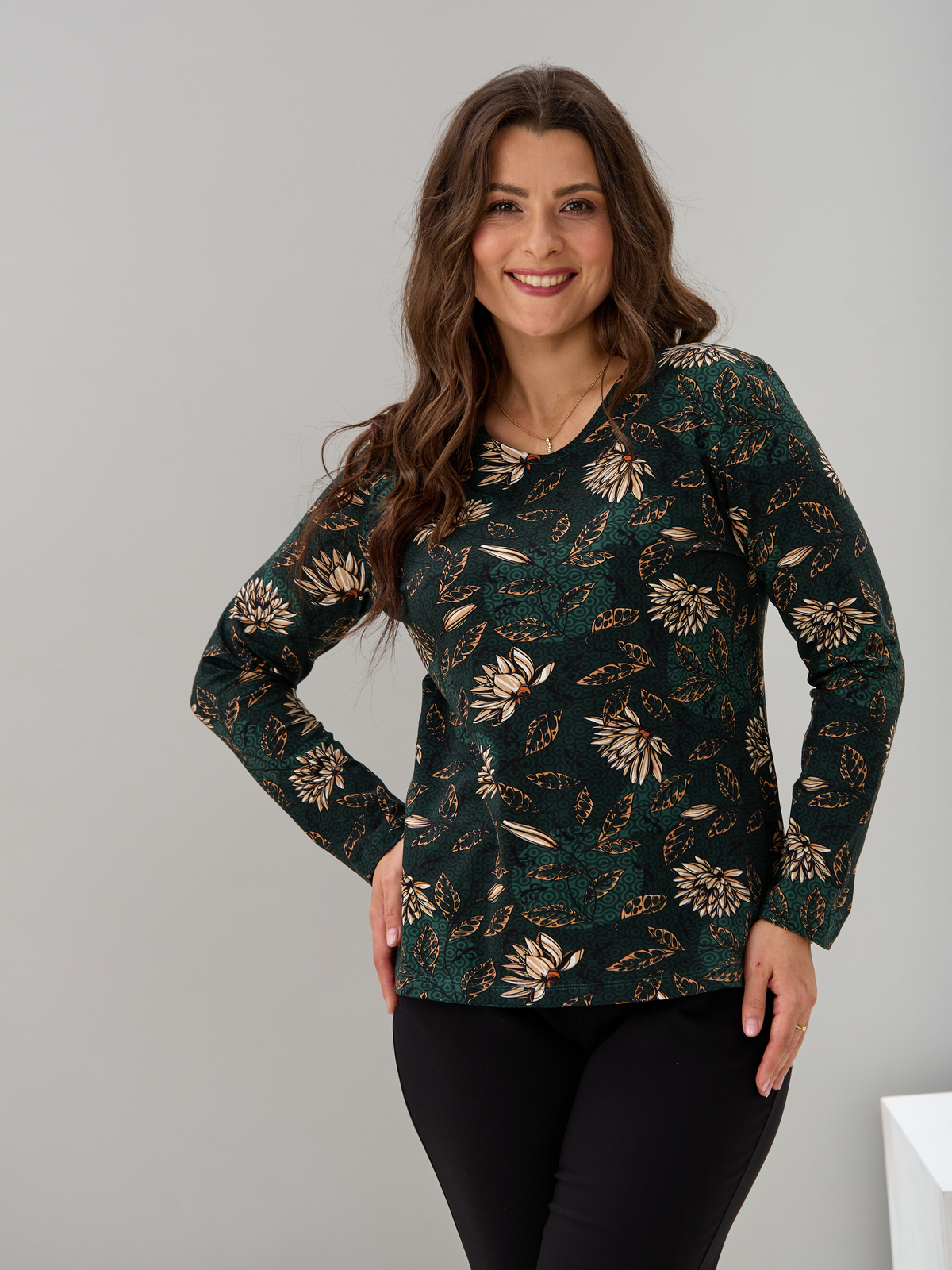 Лонгслив ЛНкл-081/изумрудный-хризантемы